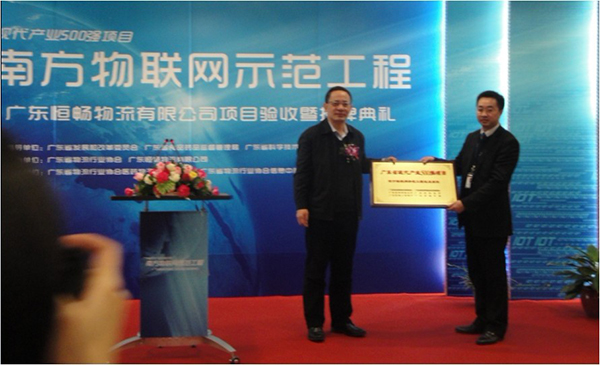 2月28日,广东省现代产业500强项目,南方物联网示范工程--广东恒畅物流有限公司项目验收暨授牌典礼在国家软件产业基地天河软件园召开。参加典礼的有省发改委鲁修禄副主任、省食品药品监督局药品流通监管处陈卓鹏处长、省物流行业协会马仁洪秘书长、中国医药集团一致药业有限公司林敏副总经理、国药物流马建聪总经理和江功菲达宝开电品有限公司亓卫峰总经理等领导。