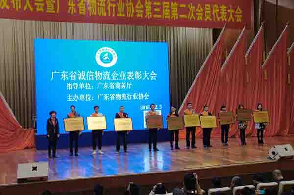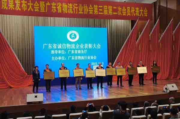 12月3日,2015年度“广东省诚信物流企业”于广州举行授牌仪式,广东省商务厅市场秩序与调节处黄述芸副处长为荣获2015年度“广东省物流诚信企业”的20家物流企业颁发了荣誉牌匾。