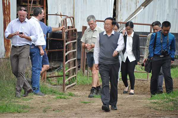 下午,工作组参观了珀斯西北地区的一个牧场,该牧场占地1000公顷,主要饲养的牛的品种为母牛、公牛、种牛等,主要为草饲。牧场每年的降雨量充足,草场非常肥沃。之后,还参观了当地的农业灌溉设施。参观过程中,工作组也与西澳农业及食物部活牛项目的负责人迈特和戴尔也建立了联系,他们两位主要致力于当地的活牛产业链的发展,也给工作组详细介绍了当地的活牛养殖及出口情况。工作组组长马仁洪向他们介绍了中澳21世纪海上物流大通道及作为早期收获项目的活牛产业链建设推进计划,副组长李志安也向他们介绍了活牛项目的具体进展情况。最后,马会长向迈特先生赠送了“中澳21世纪海上物流大通道”规划图。