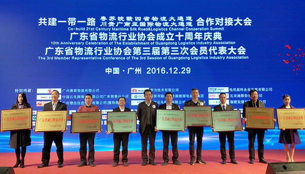 12月29日,在共建21世纪海上丝绸之路国际物流大通道合作对接大会暨广东省物流行业协会成立十周年庆典大会、广东省物流行业协会第三届第三次会员代表大会的物流行业盛会上,协会刘武会长对荣获2016年度“广东省诚信物流企业”的10家物流企业、“广东省诚信物流园区”的3个物流园区进行颁牌。