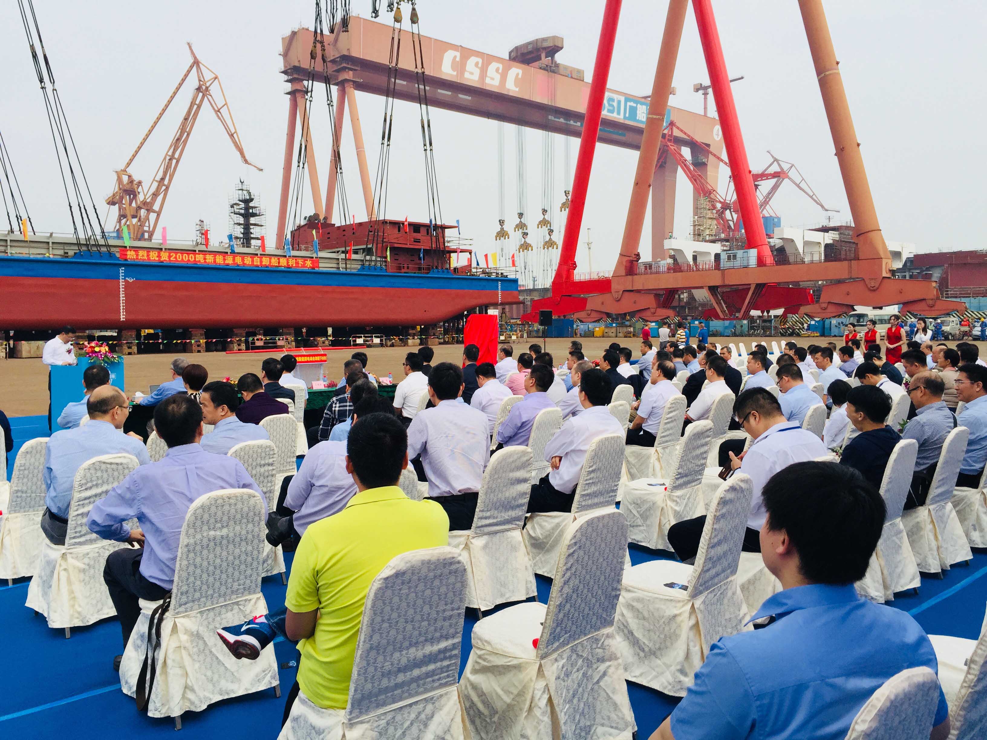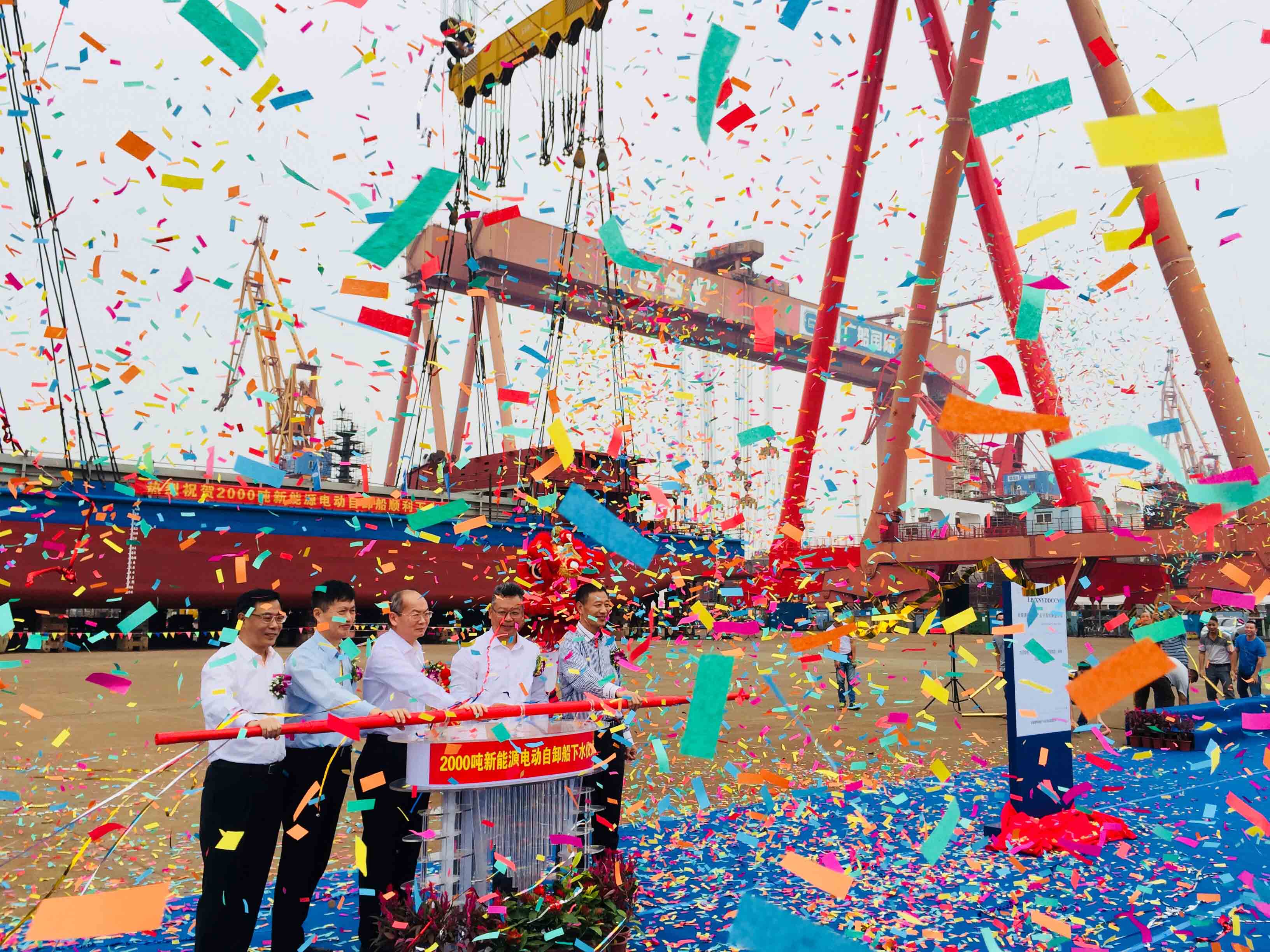 世界首艘2000吨级新能源电动自卸船在南沙整体吊装下水