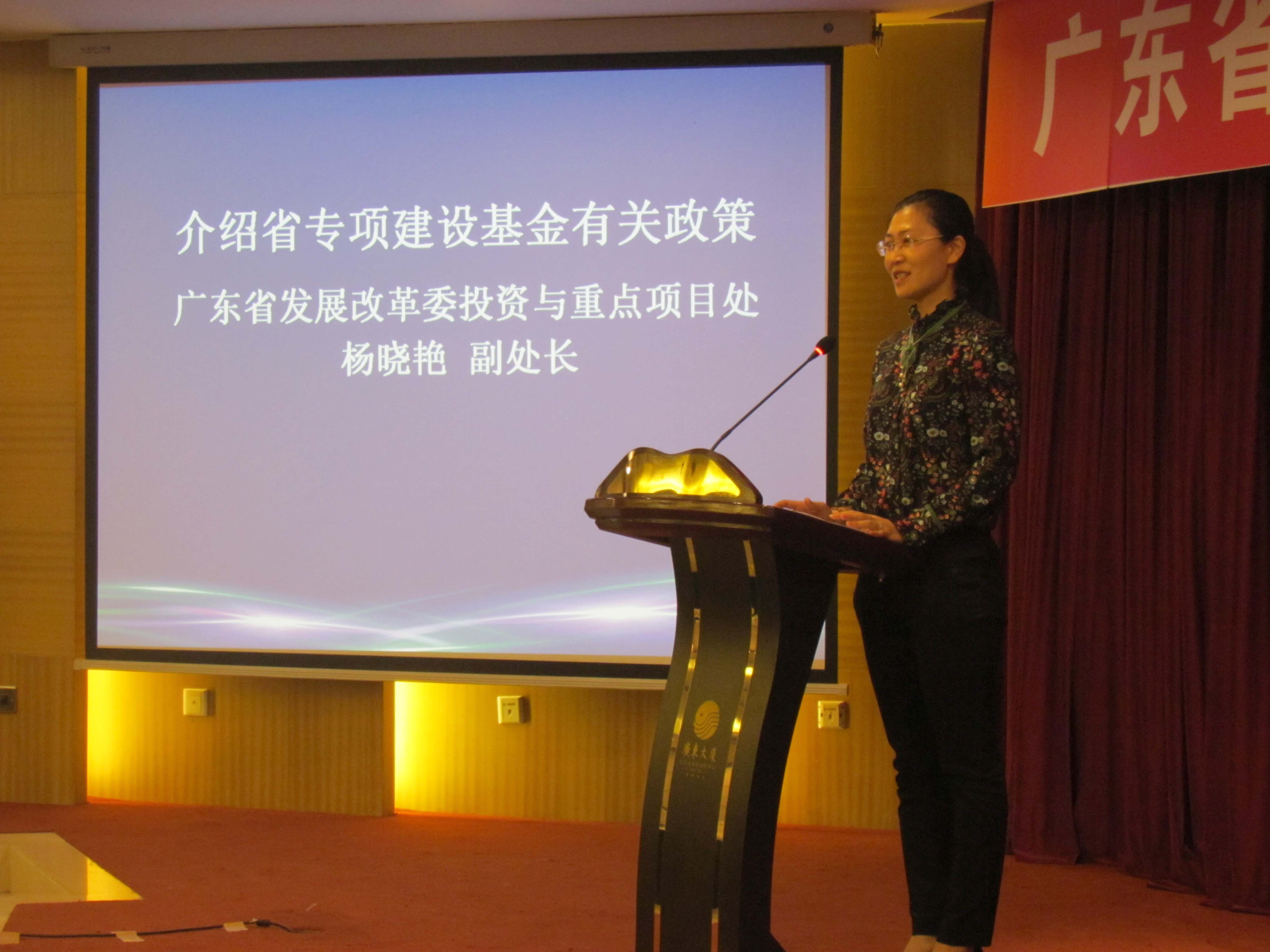 会议由省发改委服务业发展处熊静副处长主持,省发改委投资与重点项目处杨晓艳副处长宣讲《广东省发展和改革委员会关于印发广东省专项建设基金组建方案的通知》、《关于报送广东省专项建设基金项目贴息申请材料的通知》等相关政策。