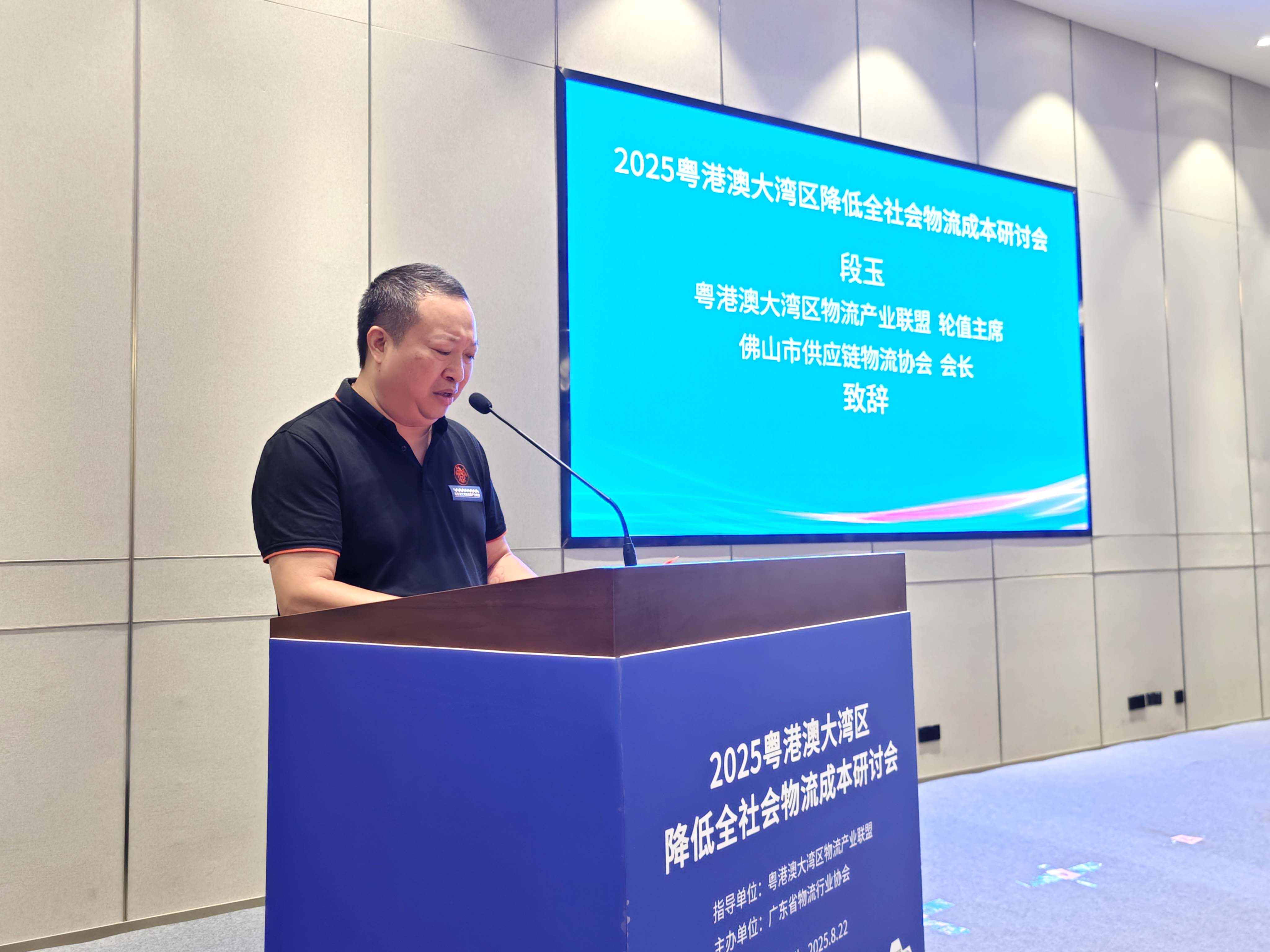 会上,粤港澳大湾区物流产业联盟轮值主席、佛山市供应链物流协会会长段玉作致辞。他指出,粤港澳大湾区作为全球开放程度最高、经济活力最强的区域之一,承载着建设“新发展格局战略支点”的重大使命。尽管大湾区物流基础设施日益完善,但全社会物流总费用占GDP的比重仍有进一步优化的空间,这既是挑战,也是机遇。同时强调了降低物流成本不是简单的价格竞争,而是需要通过技术赋能、模式创新与跨域协同,构建高效、绿色、智慧的物流生态体系。