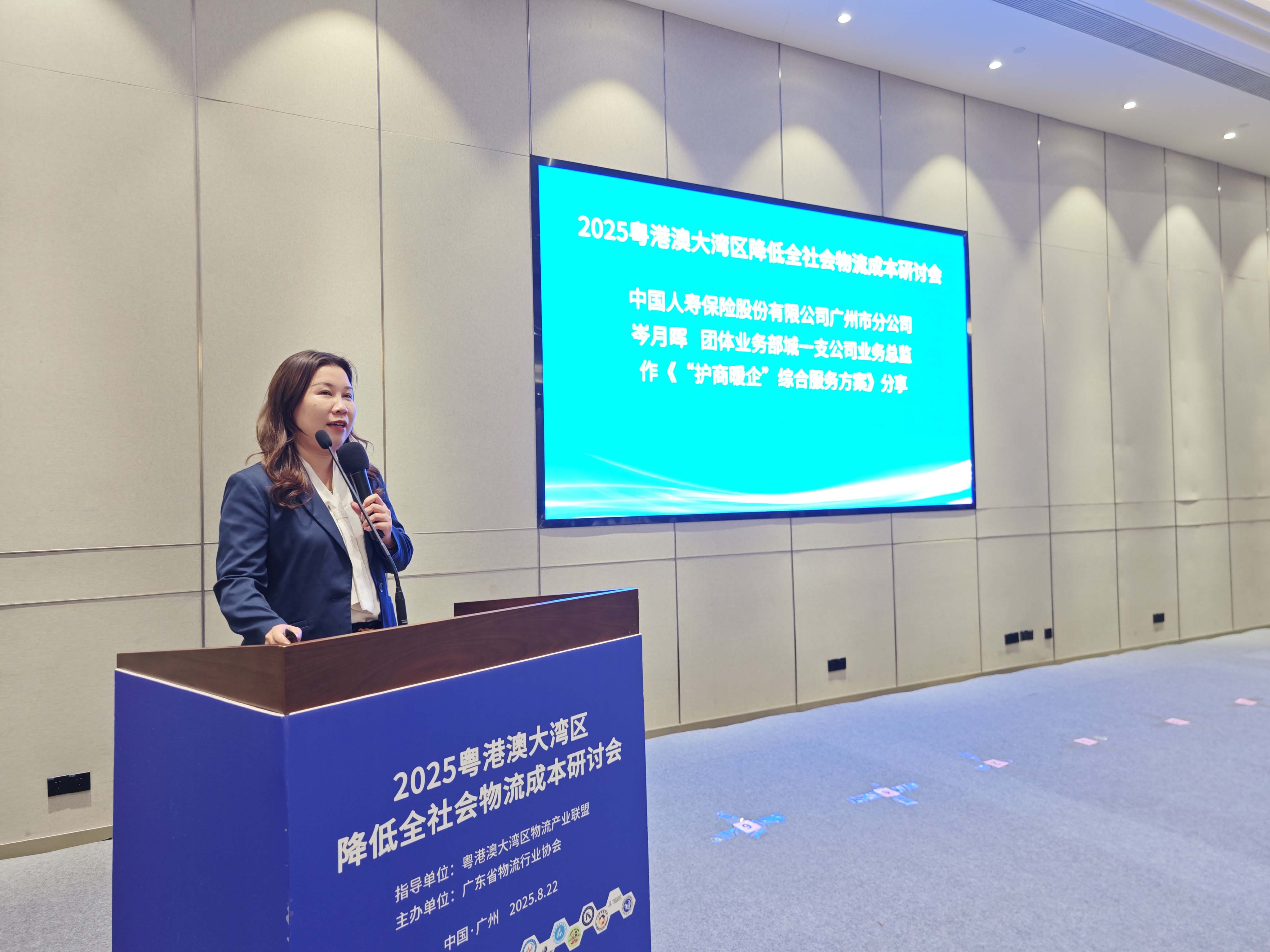 中国人寿保险股份有限公司广州市分公司团体业务部城一支公司业务总监岑月晖以《“护商暖企”综合服务方案》为主题,分享了中国人寿如何通过保险保障、金融服务、健康管理等多维度支持,为物流企业提供全方位的风险保障和增值服务,助力企业稳健经营和降本增效。