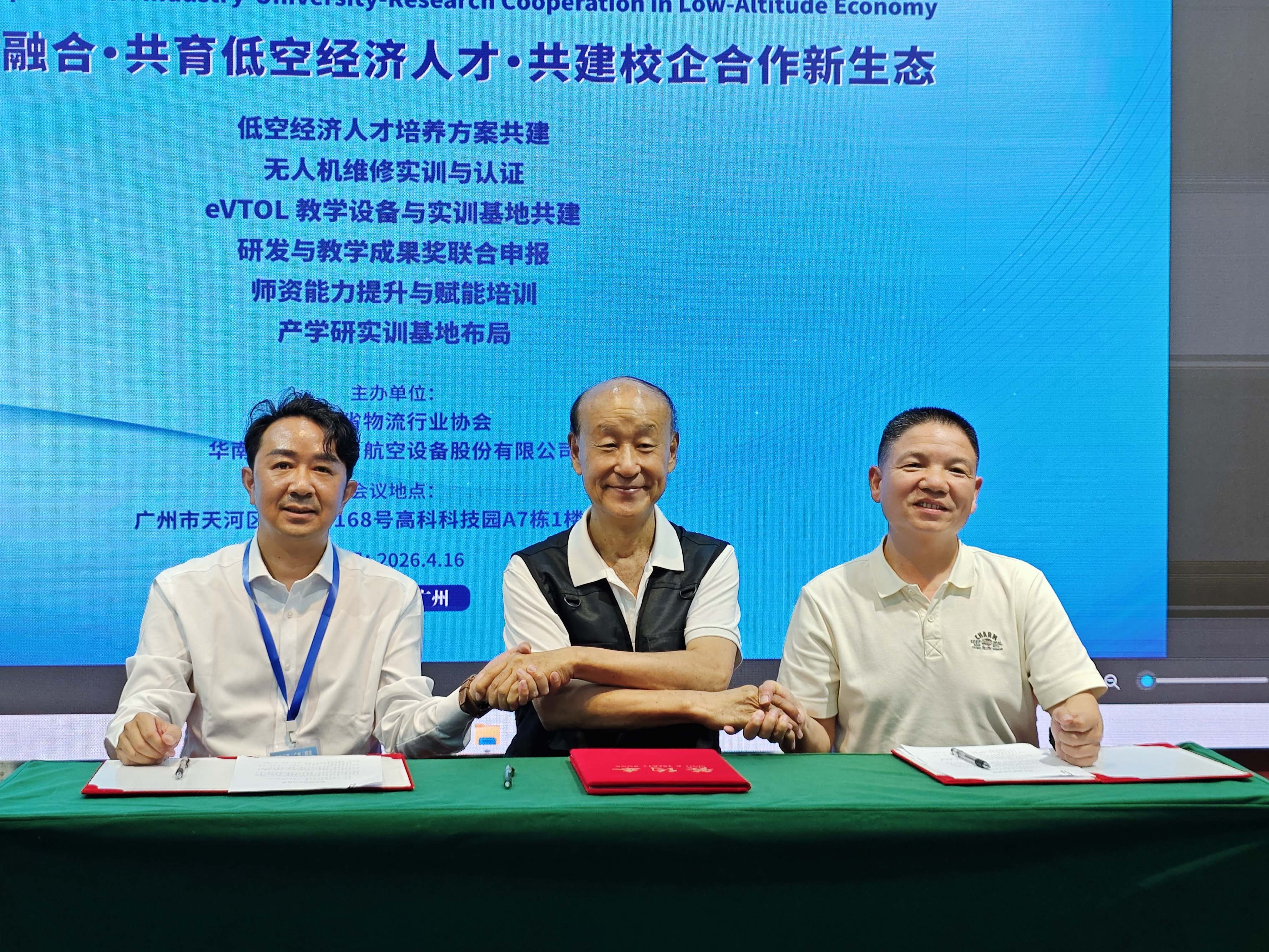 会议现场还举行了“行校企”合作签约仪式,在全体与会嘉宾的见证下,华体会最近消息执行会长马仁洪、华南科明(广州)航空设备股份有限公司董事长温伯谦分别与广东交通职业技术学院航空与无人机学院院长刘志军、广州市交通技师学院航空服务产业系主任吴显强共同签署了战略合作协议,三方将共同打造低空经济领域产教融合新范式。