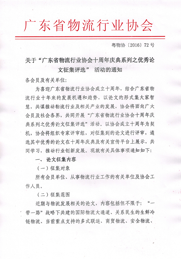 关于“广东省物流行业协会十周年庆典系列之优秀论文征集评选” 活动的通知