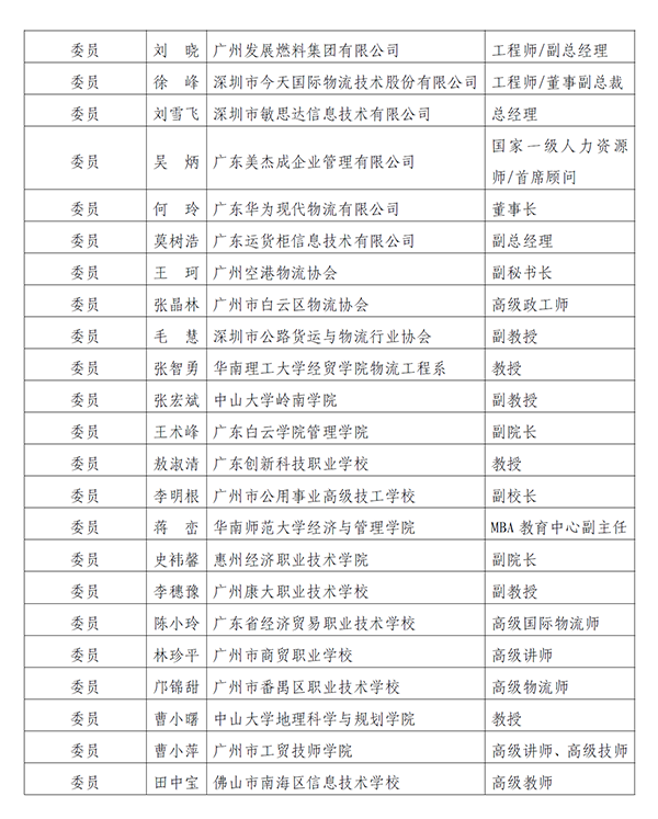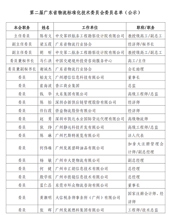 根据《广东省质量技术监督局关于专业标准化技术委员会的管理办法》(粤质监〔2008〕142号)、《广东省物流标准化技术委员会章程》规定及2015年全省省级专业标准化技术委员会考核情况,按照《广东省质监局关于做好2016年省级专业标准化技术委员会换届工作的通知》要求,我委对新一届委员进行调整补充,现将名单进行公示。
