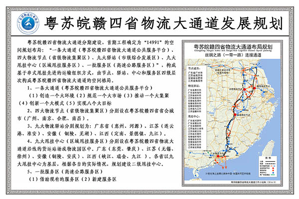 粤苏皖赣四省物流大通道分期建设,首期工程确定为“14991”的空间规划布局:“一条大通道(粤苏皖赣四省物流大通道公共服务平台)、四大物流节点(省级物流集聚区)、九大驿站(市级综合发展区)、九大甩挂中心(区域甩挂服务区)、一批服务区(高速公路服务区)”,构成基于串式甩挂先进的运输组织方式,由节点、驿站、中心和服务区四级层次构成粤苏皖赣四省物流大通道的空间格局。