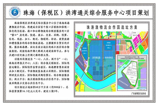 珠海保税区洪湾通关综合服务中心位于珠海珠港澳物流合作园,将建成全国首个集口岸联检和保税一体化的为机场、港口和公路物流综合配套服务的口岸“窗口”及电商、快递、展示、交易、采购、结算、信息、甩挂、加工、配送、物联网、培训、商贸旅游和增值服务的综合性物流基地,支撑横琴自贸区的升级,服务珠港澳、面向东南亚地区的珠江西岸综合物流枢纽,连接陆海丝绸之路两大通道南部节点,参与共建21世纪海上丝绸之路的桥头堡。