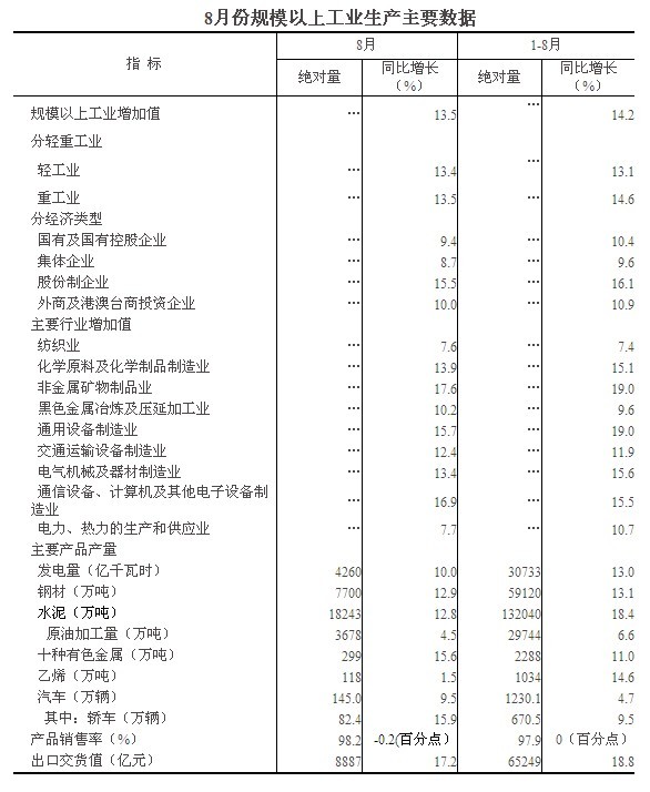 分轻重工业看,8月份,重工业增长13.5%,轻工业增长13.4%。