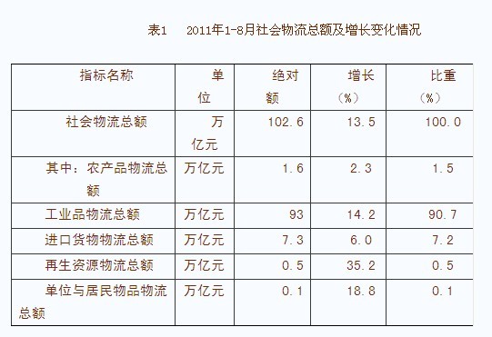 1-8月社会物流总额为102.6万亿元,按可比价格计算,同比增长13.5%,增幅比1-7月回落0.1个百分点,比去年同期回落3.7个百分点,回落幅度继续收窄。总体来看,社会物流总额仍然保持较快增长态势,且增势平稳。