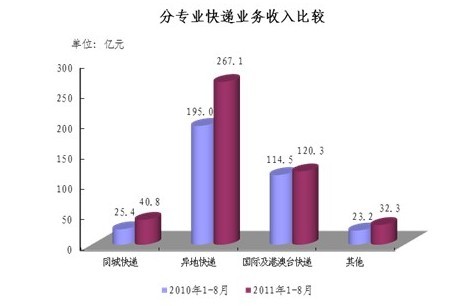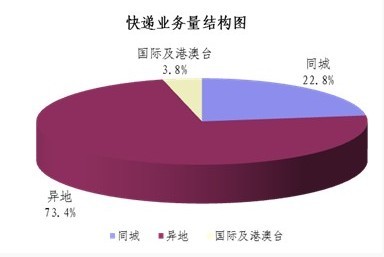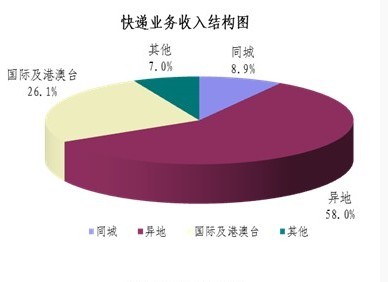1-8月,同城、异地、国际及港澳台快递业务收入分别占全部快递收入的8.9%、58%和26.1%;业务量分别占全部快递业务量的22.8%、73.4%和3.8%。 同城快递业务收入的比重上升1.8个百分点,异地快递业务收入的比重上升3.6个百分点,国际及港澳台业务收入的比重下降了5.9个百分点。