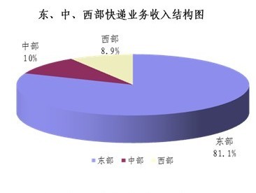 1-8月,东、中、西部地区快递业务收入的比重分别为81.1%、10.0%和8.9%,业务量比重分别为79.3%、11.6%和9.1%。与去年同期相比,东部地区快递业务收入比重下降了0.4个百分点,快递业务量比重上升了0.2个百分点;中部地区快递业务收入比重上升了0.3个百分点,快递业务量比重下降了0.2个百分点;西部地区快递业务收入比重上升了0.1个百分点,快递业务量比重持平。