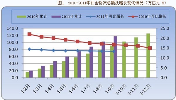 在社会物流总费用中,前三季度运输费用3万亿元,同比增长15.4%。运输费用较快增长,主要是受油价以及用工成本上涨等因素影响。去年4季度以来,国内汽、柴油价格先后四次上调。2011年9月流通环节柴油价格累计同比上涨22.9%,汽油价格累计同比上涨17.4%。