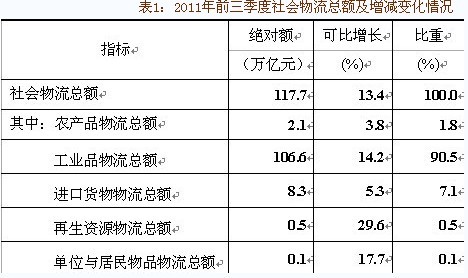 前三季度,物流运行总体形势良好,继续保持平稳较快发展,基本与国民经济发展和宏观调控目标相适应,稳定性、协调性有所增强。当前,经济发展面临的国内外环境依然十分复杂,不稳定、不确定因素较多,物流企业面临的税收、成本压力仍然存在,产业整体竞争力有待增强。从物流业PMI来看,9月物流业PMI收费价格指数为49.5%,依然处于低位,而中间投入价格指数则仍处于56.5%的较高水平,表明今后一个时期,物流企业经营成本增长快于收入增长的态势仍将持续。与此同时,9月物流业PMI业务活动预期指数为62.5%,虽然环比下降3.5个百分点,但依然保持在60%以上的较高水平,表明物流企业对市场预期仍然较为看好。初步预计2011年社会物流总额增长13%左右,物流业增加值增长14%左右,物流运行仍将保持平稳较快发展。