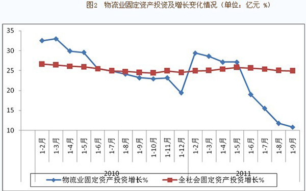 今年前三季度物流业固定资产投资完成额2.2万亿元,同比增长10.8%,增幅比上半年回落8.2个百分点,比去年同期回落12.4个百分点,比同期全社会固定资产投资增幅低14.1个百分点,差距有所扩大。其中,交通运输业投资额为1.5万亿元,同比增长仅为1.8%,增幅比上半年回落11.6个百分点,比去年同期回落22.2个百分点;仓储、邮政业投资额为0.2万亿元,同比增长31.9%;贸易业投资额为0.5万亿元,同比增长36.7%。