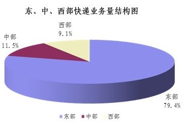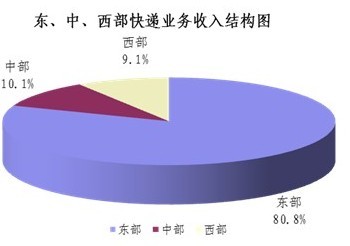 1-9月,东、中、西部地区快递业务收入的比重分别为80.8%、10.1%和9.1%,业务量比重分别为79.4%、11.5%和9.1%。与去年同期相比,东部地区快递业务收入比重下降了0.5个百分点,快递业务量比重上升了0.2个百分点;中部地区快递业务收入比重上升了0.3个百分点,快递业务量比重下降了0.2个百分点;西部地区快递业务收入比重上升了0.2个百分点,快递业务量比重与去年同期持平。