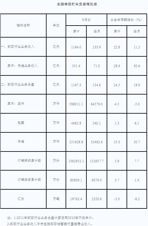 9月份,快递业务量完成3.2亿件,同比增长50.7%;业务收入完成71亿元,同比增长30.6%。