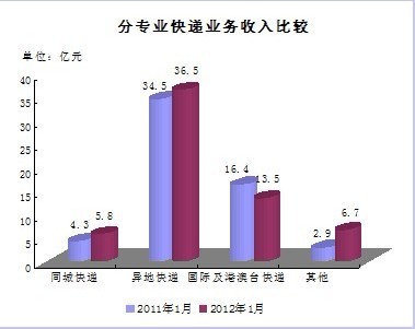 2012年1月,受春节假日等因素影响,邮政行业同比增速放缓。邮政企业和全国规模以上快递服务企业业务收入(不包括邮政储蓄银行直接营业收入)完成155亿元,同比增长12.2%;业务总量完成132.6亿元,同比增长3.4%。