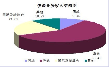 1月,同城、异地、国际及港澳台快递业务收入分别占全部快递收入的9.3%、58.4%和21.6%;业务量分别占全部快递业务量的23.4%、73.3%和3.3%。同城快递业务收入的比重上升1.9个百分点,异地快递业务收入的比重下降0.9个百分点,国际及港澳台业务收入的比重下降了6.6个百分点。