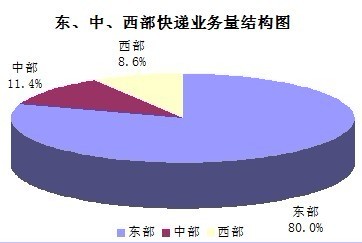 1月,东、中、西部地区快递业务收入的比重分别为80.7%、10.1%和9.2%,业务量比重分别为80.0%、11.4%和8.6%。与去年同期相比,东部地区快递业务收入比重上升0.5个百分点,快递业务量比重上升了1.6个百分点;中部地区快递业务收入比重下降了0.3个百分点,快递业务量比重下降了1个百分点;西部地区快递业务收入比重下降了0.2个百分点,快递业务量比重下降了0.6个百分点。