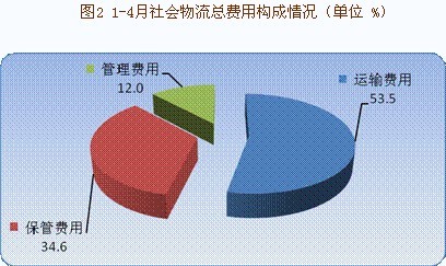 1-4月社会物流总费用2.6万亿元,同比增长11.8%,增幅比一季度回落0.4个百分点,比去年同期回落5.9个百分点。其中,运输费用1.4万亿元,同比增长11.1%,增幅与一季度持平。受燃油价格上涨等影响,道路运输费用增长突出,同比增长13.1%,增幅比一季度提高0.3个百分点,比社会物流总费用和运输费用分别高1.3个和2个百分点。保管费用0.9万亿元,同比增长12.3%,增幅比一季度回落0.7个百分点。其中,利息费用同比增长14.1%,增幅比保管费用高1.8个百分点。管理费用0.3万亿元,同比增长13%,增幅比一季度回落1.7个百分点。