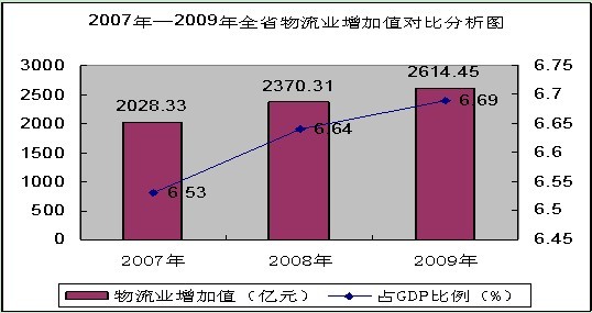 2009年,广东省物流业增加值为2614.45亿元,按现价计算,同比增长10.30%;占同期全省GDP的比例为6.69%,与去年同期相比上升了0.75个百分点。