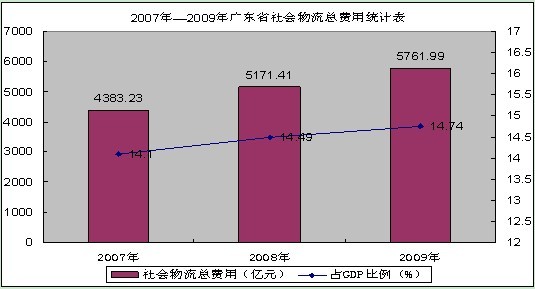 2009年,广东省社会物流总费用为5761.99亿元,按现价计算,同比增长11.42%;占同期全省GDP的比例为14.74%,与去年同期相比上升了1.72个百分点。