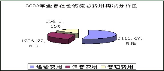 从2009年广东省社会物流总费用构成来看,运输费用为3111.47亿元,按现价计算,同比增长12.08%,占同期全省社会物流总费用的54%;保管费用为1786.22亿元,按现价计算,同比增长15.00%,占同期全省社会物流总费用的31%;管理费用为864.30,按现价计算,同比增长2.62%,占同期全省社会物流总费用的15%。