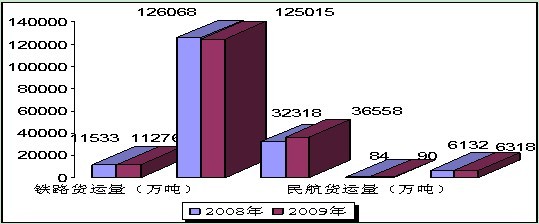 2009年,广东省社会货运量累计完成179257万吨,同比增长16.8%。其中,铁路货运量累计完成11276万吨,同比下降2.3%;公路货运量累计完成125015万吨,同比下降0.84%;水运货运量累计完成36558万吨,同比增长7.7%;民航货运量累计完成90,同比增长6.7%;管道运输量累计完成6318万吨,同比增长0.88%。