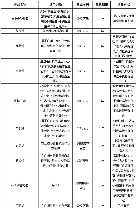 为贯彻落实党中央、国务院关于统筹做好疫情防控和经济社会发展的决策部署,落实好央行支农支小专项政策,市工业和信息化局会同市金融局、中国人民银行广州分行营业管理部整理了相关金融产品及联系方式。现将相关产品清单下发给你们,请积极发动符合条件的企业根据需求与相关金融机构精准对接。具体金融产品及业务经办银行、相关机构如下: