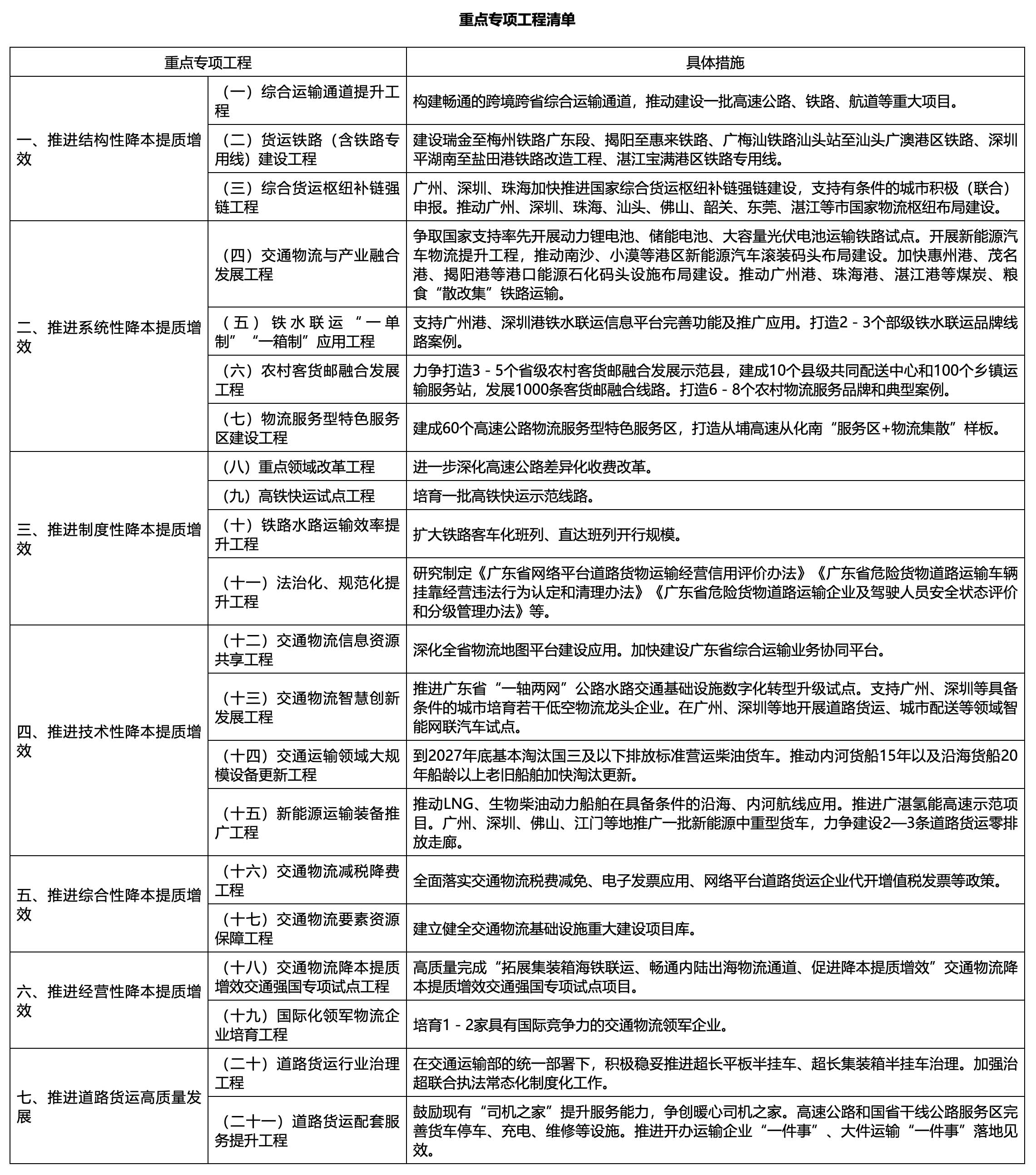 (一)提升交通物流通道承载能力。构建畅通的跨境跨省综合运输通道,推动建设一批高速公路、铁路、航道等重大项目。依托珠三角高速公路网和高等级航道网,构建协同高效的产业链供应链物流体系,服务珠三角地区产业集群高质量发展。强化粤东粤西粤北地区与珠三角地区物流通道衔接,服务珠三角地区产业转移和区域协同发展。依托高速公路、干线铁路出省通道,服务国内经济大循环。依托主要港口、机场和铁路枢纽,提升国际物流通道能级,服务我省外向型经济发展。